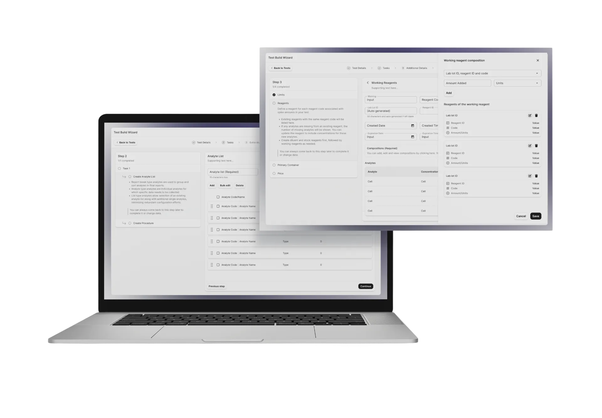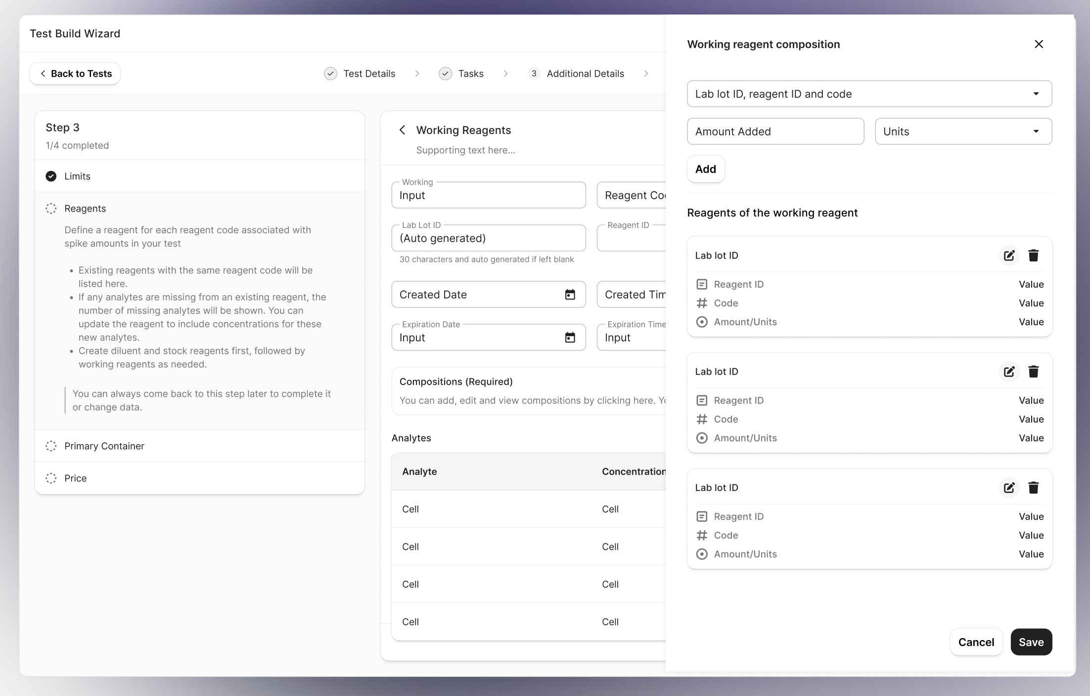 Solution: Expandable drawers that surface additional, lab-specific information only when needed. This allowed advanced users and larger labs to access deeper configuration options, while keeping the core workflow streamlined for users who didn’t require that level of detail.