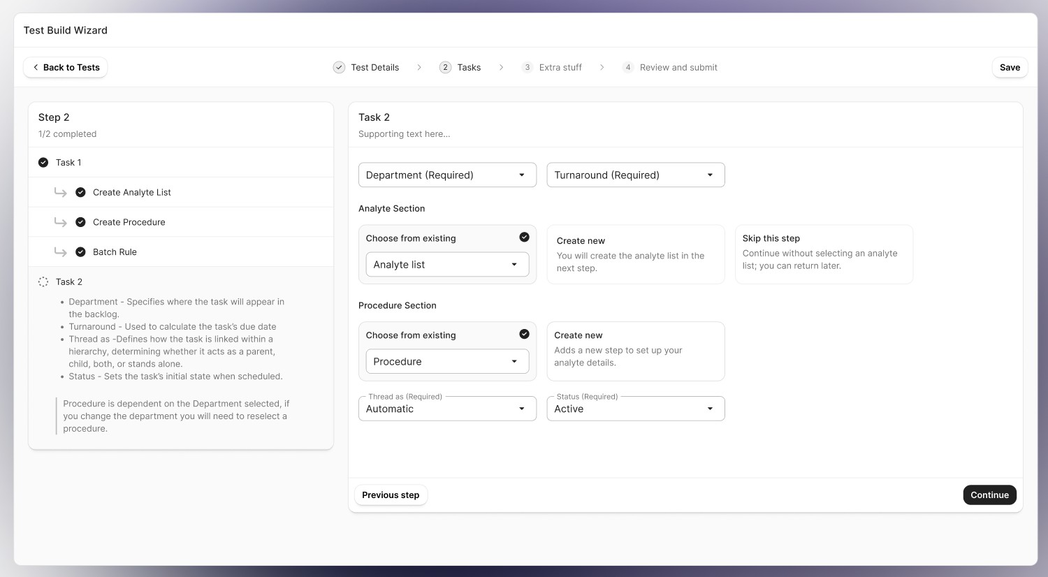 Jobs to be done: Define the test name and description, establish the procedure and methodology, and add any required analytes. Configure batching rules, assign appropriate limits and reagents, specify container requirements, and complete a final validation before submitting the test.